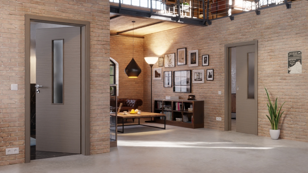 Więcej przestrzeni i komfortu: Drzwi przesuwne w strukturalnym taupe z serii Versio od Lebo nadają Twoim czterem ścianom ekstrawagancki charakter.