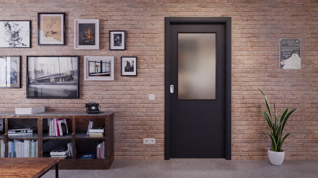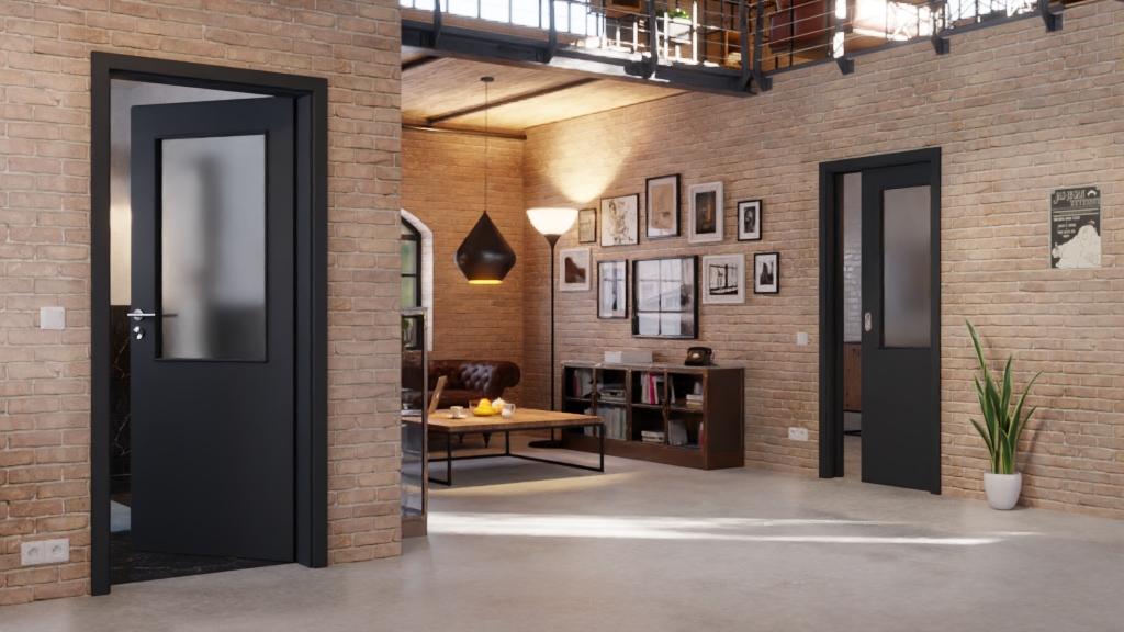 Dla większej swobody w Twoich czterech ścianach: Drzwi przesuwne w ultramatowym antracycie podobnym do RAL 7016 z serii Versio od Lebo wyróżniają się niezwykłą powierzchnią.