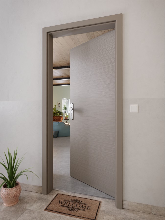 Dla eleganckiego wejścia: Drzwi wejściowe w strukturalnym taupe z serii Versio od Lebo zachwycają swoimi solidnymi właściwościami.