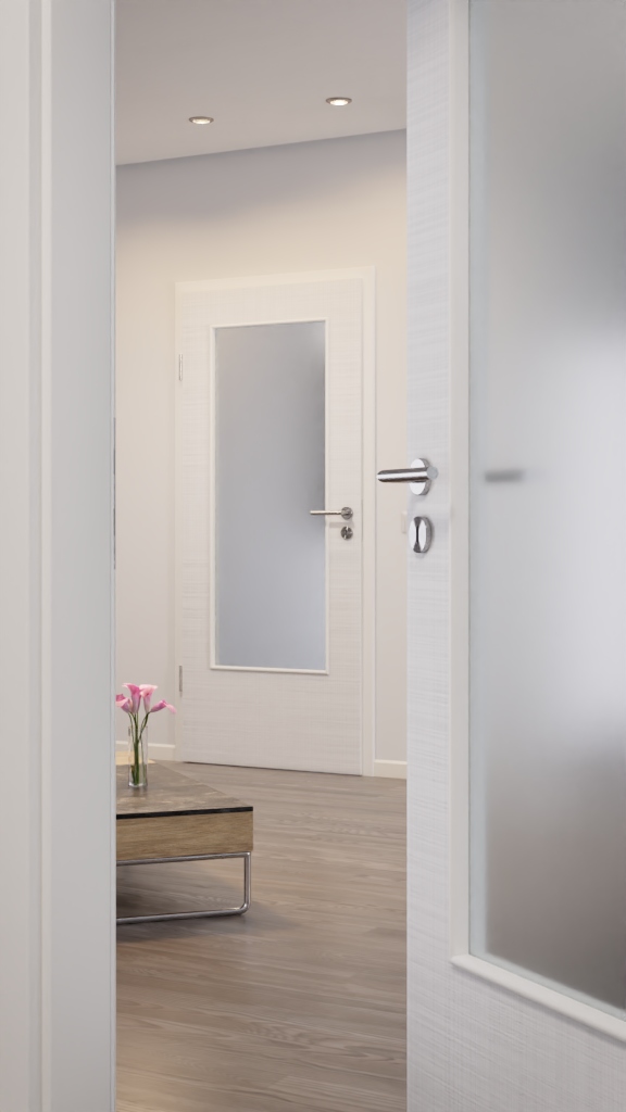 Stylowy design, który pozostaje: Dzięki szklanej wkładce drzwi wewnętrzne w kolorze Cotton Like White, podobne do RAL 9016 z serii Versio od Lebo wprowadzą do Twojego domu więcej światła i przytulności.