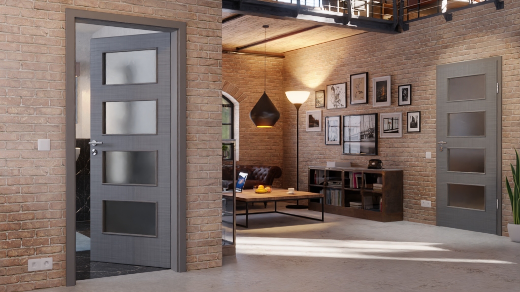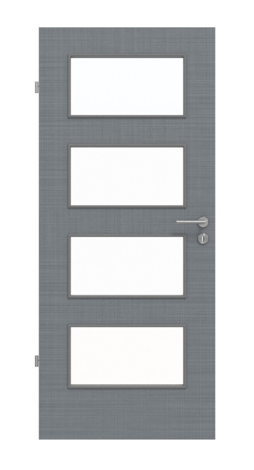 Delikatne linie są widoczne na szarym dekorze tekstylnym. Można je również odczuć dotykowo dzięki wytłoczonej strukturze na powierzchni odpornej na ścieranie i zarysowania. W skrzydle drzwi znajdują się cztery okna świetlne.