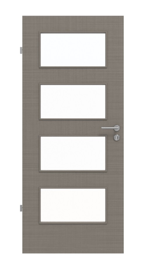 Dzięki delikatnym liniom, które poprzez wytłoczoną strukturę są również odczuwalne dotykowo, powstaje naturalny dekor tekstylny. Dzięki właściwościom odpornym na ścieranie i zarysowania możesz cieszyć się wysoką trwałością i łatwością w pielęgnacji. Cztery przeszklenia kształtują obok ekstrawaganckiej powierzchni wygląd skrzydła drzwiowego.