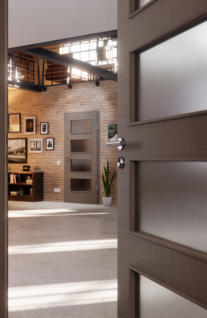 Drzwi odporne na zarysowania z nietypową powłoką i zintegrowanym przeszkleniem: