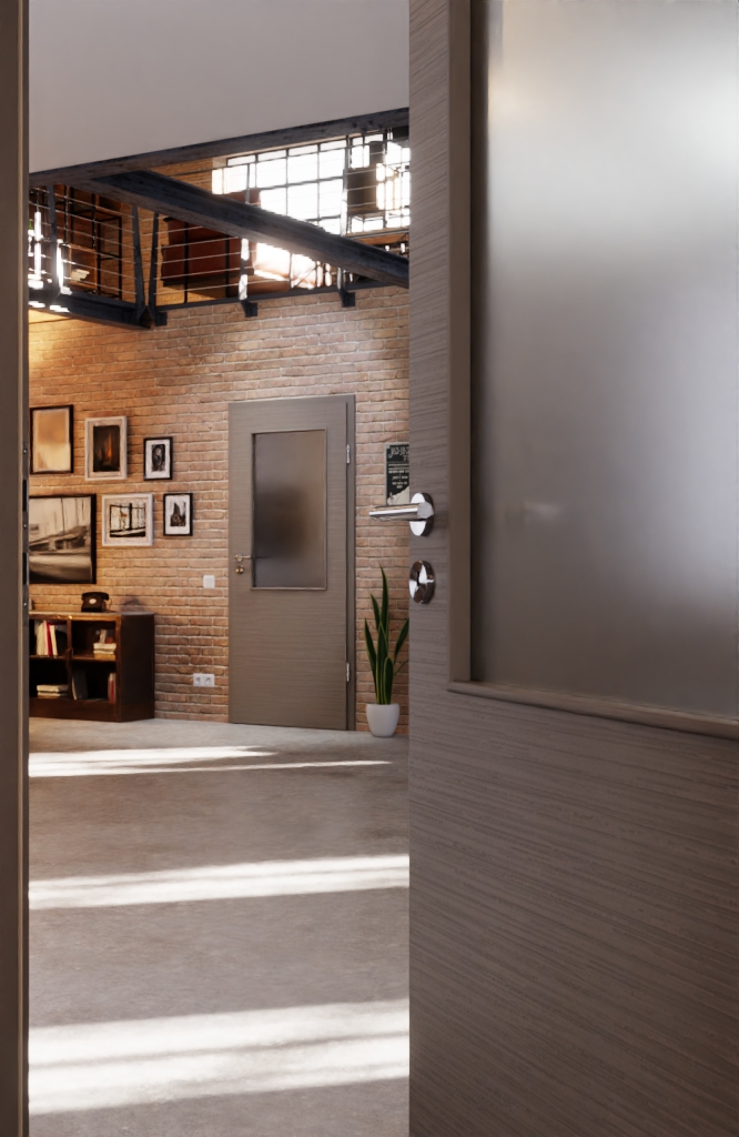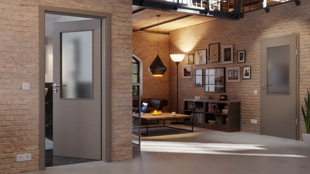 Wysoka stabilność i elegancki design w jednym pakiecie: Dzięki szklanej wkładce drzwi wewnętrzne w strukturalnym taupe z serii Versio od Lebo wprowadzą do Twojego domu więcej światła i przytulności.