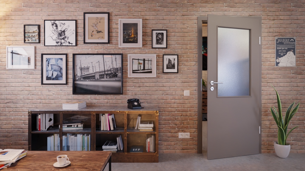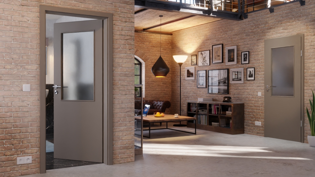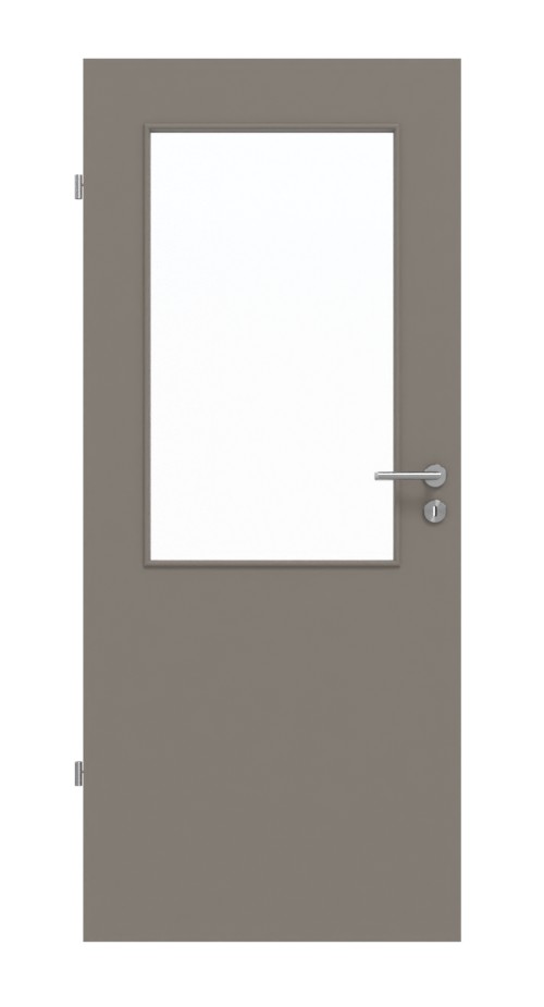 Funkcja antyodciskowa oraz wysoka odporność na ścieranie i zarysowania nadają matowej powłoce długą żywotność. Projekt skrzydła drzwiowego, obok ekstrawaganckiej, szaro-brązowej powierzchni, charakteryzuje się dużym przeszkleniem w górnej części skrzydła drzwiowego.