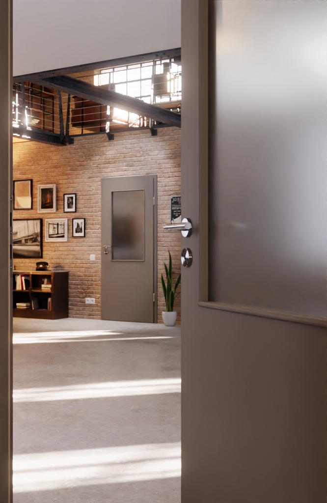 Wewnątrz znajduje się płyta pełna, dzięki czemu codzienne uderzenia nie zaszkodzą skrzydłu drzwiowemu z kanciastymi krawędziami. Do solidnego mocowania między skrzydłem a ościeżnicą w zestawie znajdują się oprócz listew szklanych i zamka wielozadaniowego dwuczęściowe zawiasy.