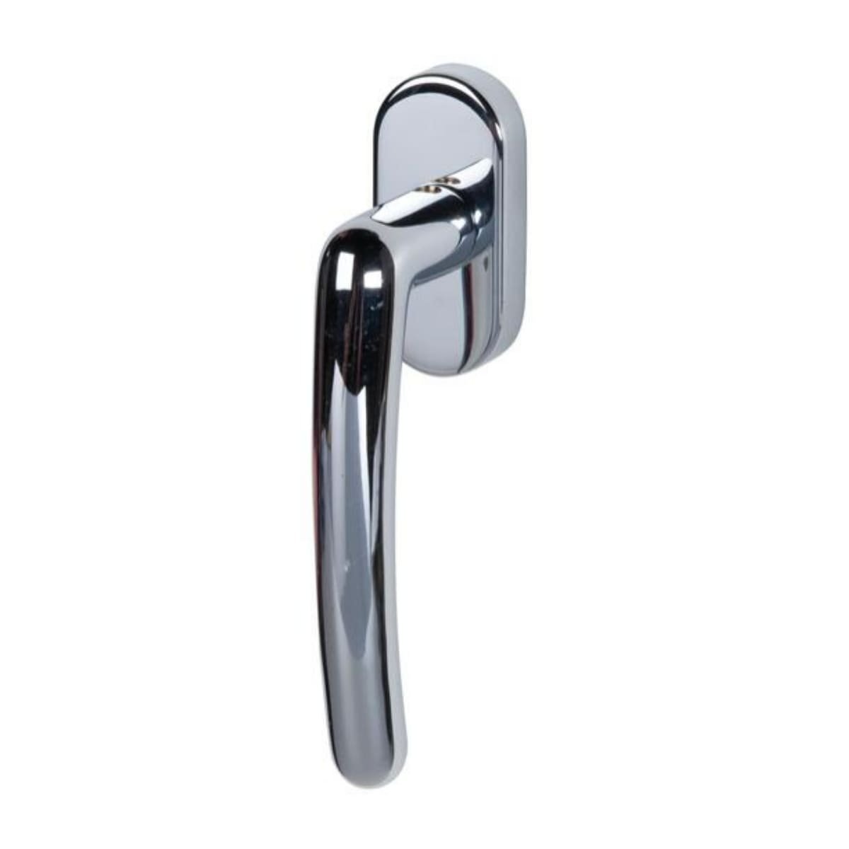 Rozeta i uchwyt mają zaokrąglone, proste kształty. Polerowana chromowana powierzchnia sprawia, że całość lśni.