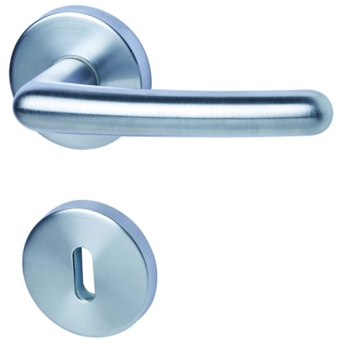 Matowe wykończenie wizualne chromu satynowanego podkreśla prostotę okrągłych rozet i klamki. Aby zapewnić poziome położenie przycisku, jest on wyposażony w sprężynę podtrzymującą .