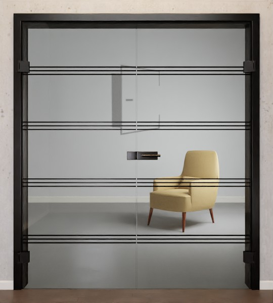 Na skrzydle drzwi z przezroczystego szkła biegnie dwanaście poziomych linii. Każda z nich jest umieszczona na wysokości głowy, klatki piersiowej, bioder i kolan. Prosty design doskonale wkomponowuje się w aranżację wnętrza.