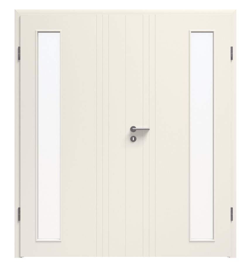Te gładkie drzwi podwójne oferują dwa elementy designerskie w jednym. Wąski otwór świetlny po stronie zawiasów z nałożonymi listwami szklanymi zapewnia otwartą atmosferę. Po stronie zamka na każdym skrzydle drzwi znajdują się trzy blisko siebie umieszczone rowkowane frezowania o szerokości 6 mm. Czysty odcień bieli w RAL 9010 lub RAL 9016 jest nakładany w procesie wielowarstwowego lakierowania.