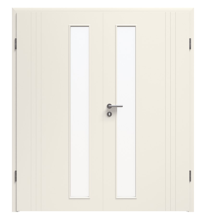 Te drzwi podwójne oferują dwa elementy designerskie w jednym. Wąski przeszklenie po stronie zamka z nakładanymi listwami szklanymi na każdym skrzydle drzwi zapewnia otwartą atmosferę. Po stronie zawiasów znajdują się trzy blisko siebie umieszczone, 6 mm szerokie rowki frezowane. Czysty odcień bieli w RAL 9010 lub RAL 9016 jest nakładany w procesie wielowarstwowego lakierowania.