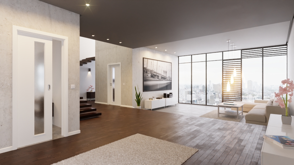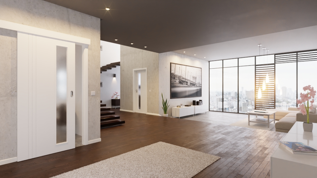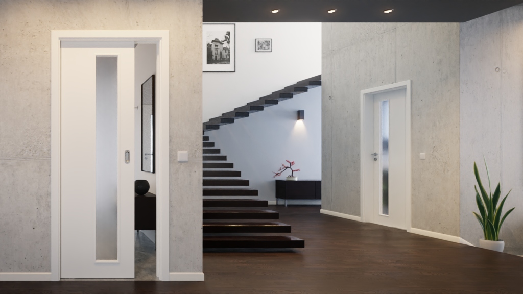 To gładkie, płaskie skrzydło drzwiowe oferuje dwa elementy designerskie w jednym. Wąski przeszklenie po stronie zamka z nakładanymi listwami szklanymi zapewnia otwartą atmosferę. Naprzeciwko znajdują się trzy blisko siebie umieszczone frezowania o szerokości 6 mm. Czysty odcień bieli w RAL 9010 jest nakładany w procesie wielowarstwowego lakierowania.