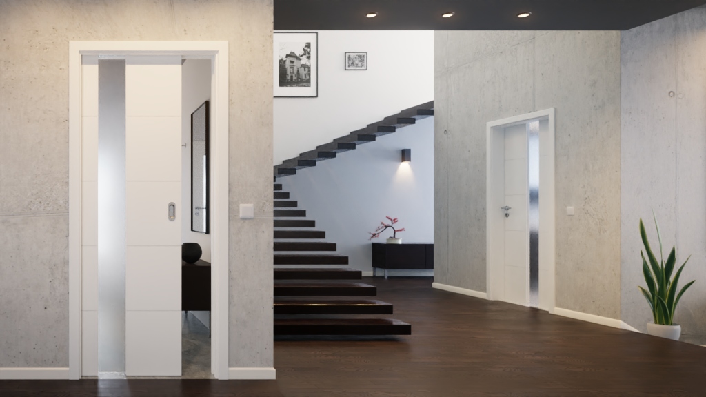 Drzwi przesuwne wprowadzają prawdziwe akcenty z otworem na światło i rowkami. Środkowo osadzony, szklany wstawka wydaje się niemal unosić. W standardzie stosuje się szkło ESG Float. Całość kompozycji przełamują cztery poziome frezowania. Każde o szerokości 6 mm i głębokości 1,35 mm przebiegają od strony do strony. Dyskretny i elegancki efekt daje wysokiej jakości powierzchnia lakieru w białym kolorze RAL 9010. Nałożona w wielowarstwowym procesie lakierowania, tworzy jednorodną, jedwabistą powierzchnię.