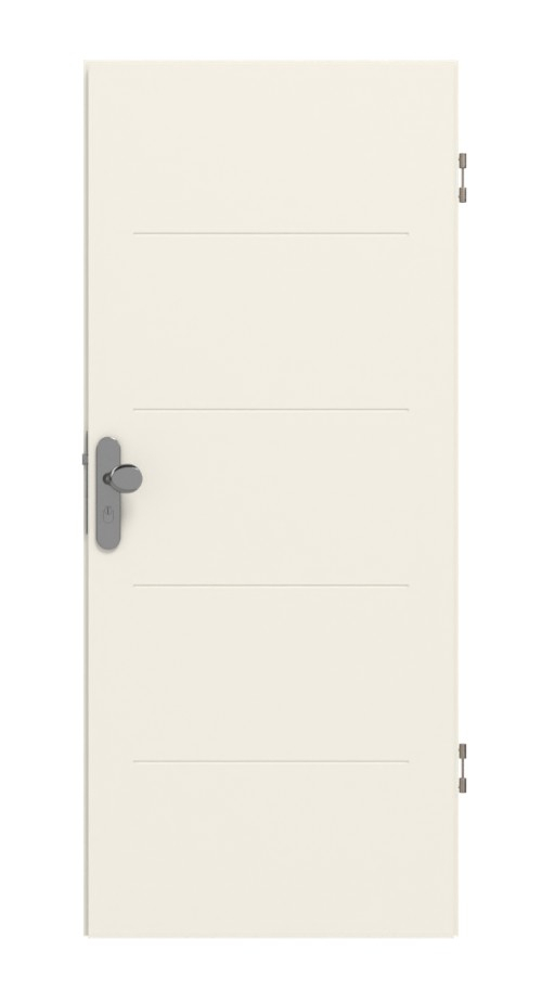 Cztery nowoczesne rowki zdobią skrzydło drzwi. Frezowania o szerokości 6 mm i głębokości 1,35 mm są umieszczone centralnie i poziomo. Nie są one ciągłe, lecz otoczone gładką powierzchnią drzwi. Powierzchnia jest wielokrotnie lakierowana w klasycznym białym odcieniu RAL 9010 lub RAL 9016. Dzięki temu uzyskują Państwo doskonałą jakość powierzchni.