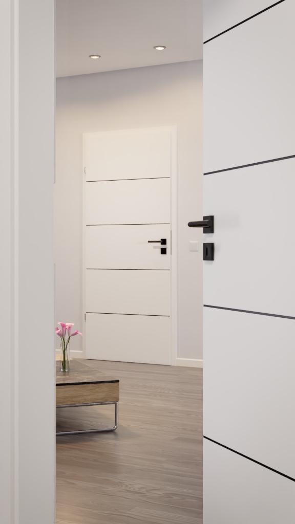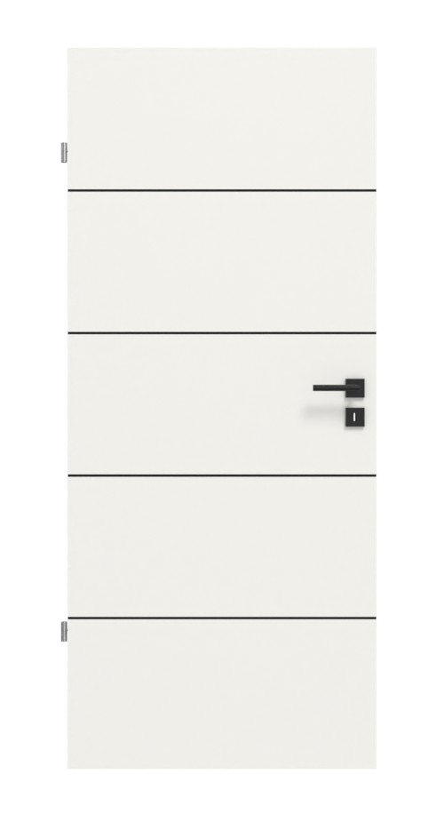 Na skrzydle drzwiowym znajdują się cztery poziome wyżłobienia. Czarne linie szczególnie dobrze prezentują się na białej powierzchni lakierowanej .