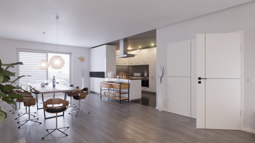 W każdym z skrzydeł drzwiowych białych z lakierem wyfrezowano poziomą i pionową fugę . Tworzą one geometryczny wzornik .
