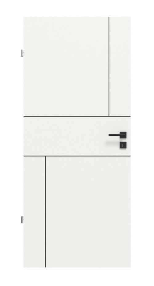 Cztery wyfrezowane czarne linie tworzą geometryczny wzornik na skrzydle drzwiowym. Biała powierzchnia lakierowana zapewnia jasną atmosferę wnętrza.