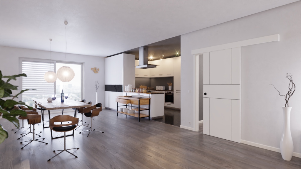 Cudowne, bezbarierowe rozwiązanie przestrzenne: Drzwi przesuwne M43 w kolorze białym z białym lakierem RAL 9016 z serii Black Basic są eleganckie i wygodne.