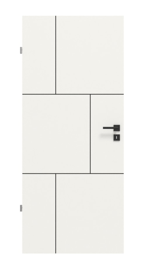 Pięć wyfrezowanych czarnych fug tworzy sześcienny wzornik na skrzydle drzwiowym. Biała powierzchnia lakierowana zapewnia jasną atmosferę wnętrza.