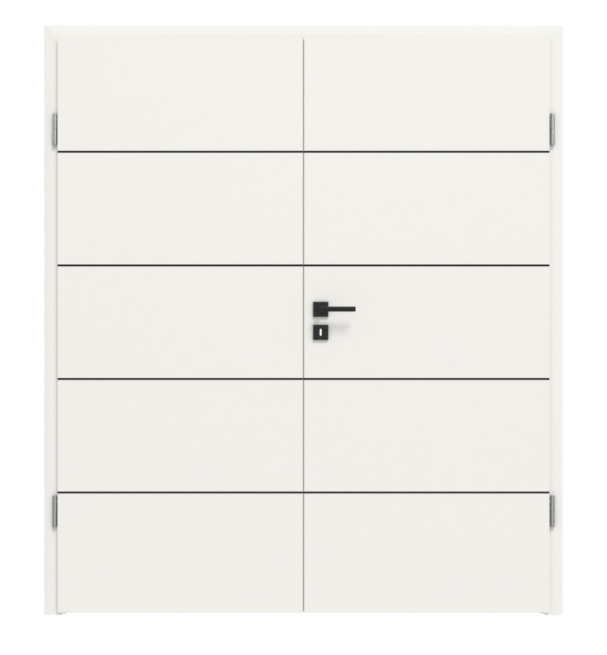 Poziome wyfrezowania przebiegają w równych odstępach na całej szerokości drzwi. Czarne linie dzielą model lakierowany na biało na pięć segmentów, tworząc prostoliniowy, geometryczny wygląd.