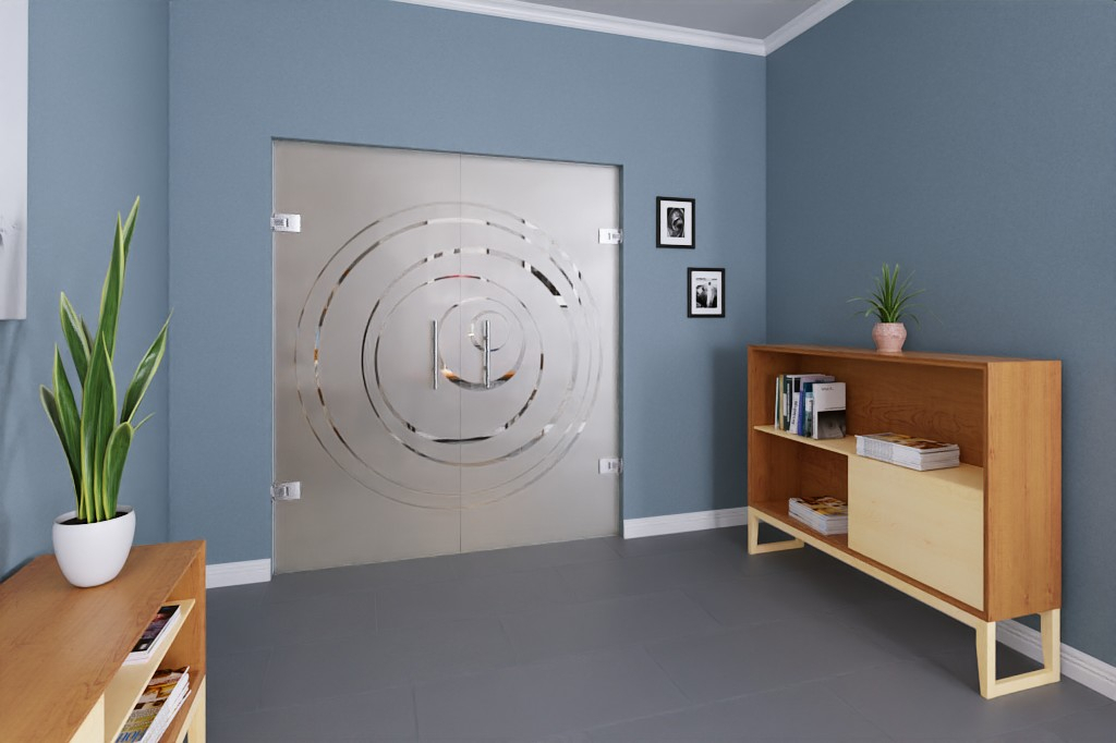 Przezroczyste koła zdobią środek matowych skrzydeł drzwiowych. Linie okręgów mają różną grubość, co nadaje motywowi żywy charakter. Kształty powiększają się od wewnątrz na zewnątrz.