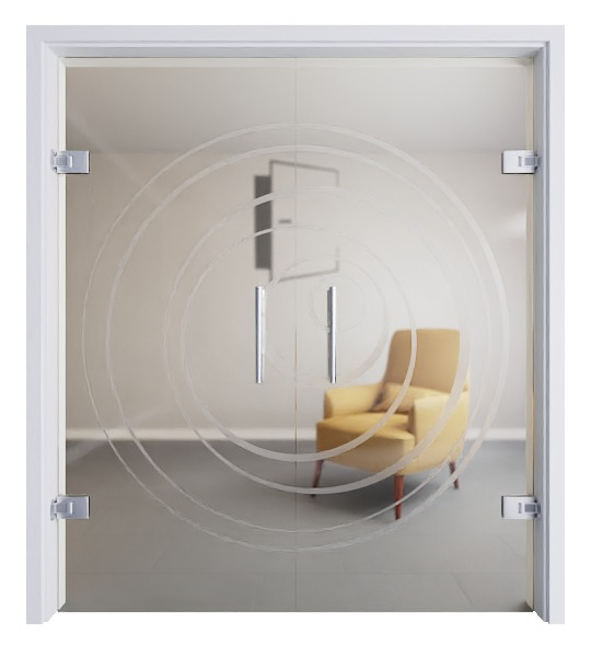 Matowe okręgi dynamicznie obramowują klamki przezroczystych drzwi dwuskrzydłowych. Linie o różnej grubości nadają kształtom żywy charakter. Okręgi stają się mniejsze od zewnątrz do wewnątrz.