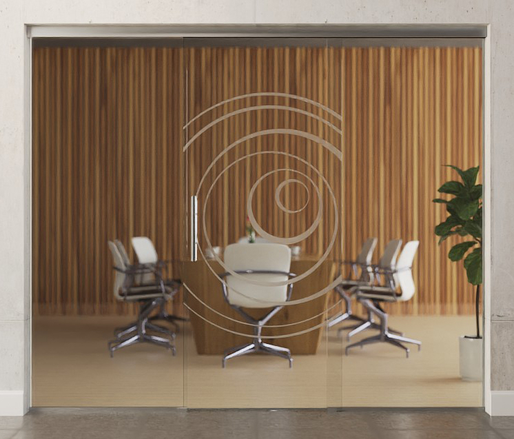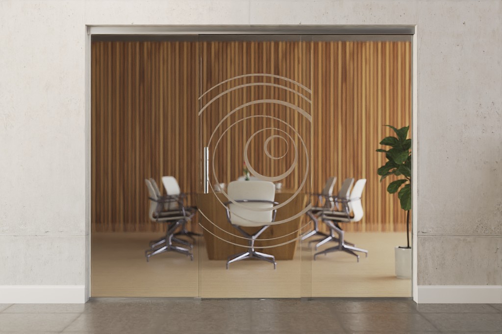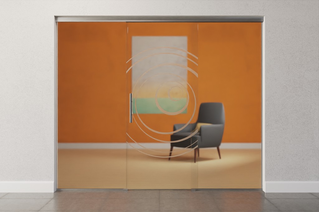 Całkowita szerokość szklanej zabudowy rozkłada się równomiernie na skrzydła drzwiowe i elementy boczne, dzięki czemu powstaje symetryczne wykończenie wizualne.