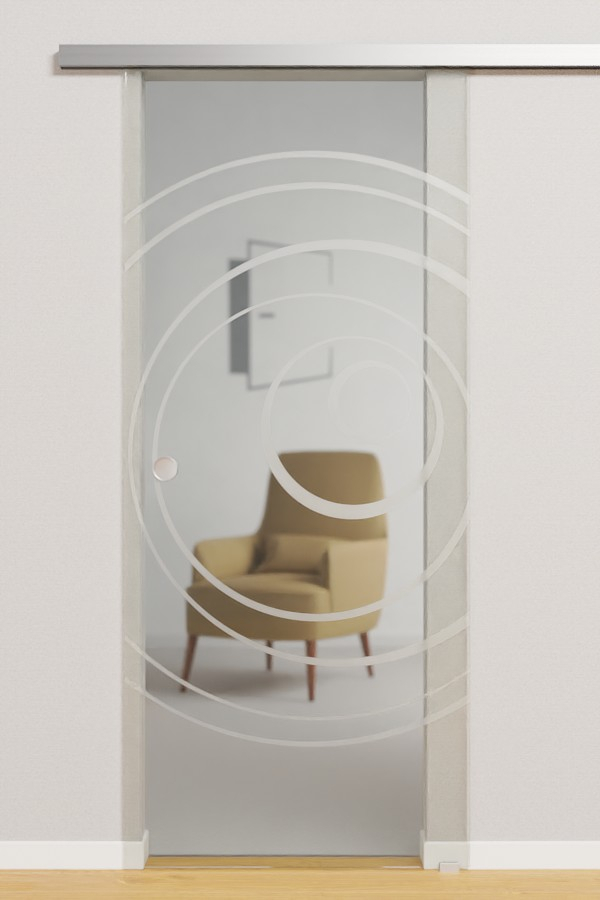 Na przezroczystym skrzydle drzwiowym filigranowy, matowy motyw koła nadaje stylowy akcent pomieszczeniu mieszkalnemu. Zwężające się linie tworzą interesujący wzór w stylu retro, a matowe wykończenie nadaje drzwiom wyjątkowy charakter.