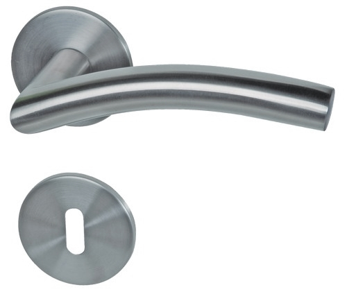 Dzięki wygiętej klamce model staje się urokliwym akcesorium przy twoich drzwiach. Satynowana stal nierdzewna nadaje zestawowi wartościowy wygląd i dotyk.