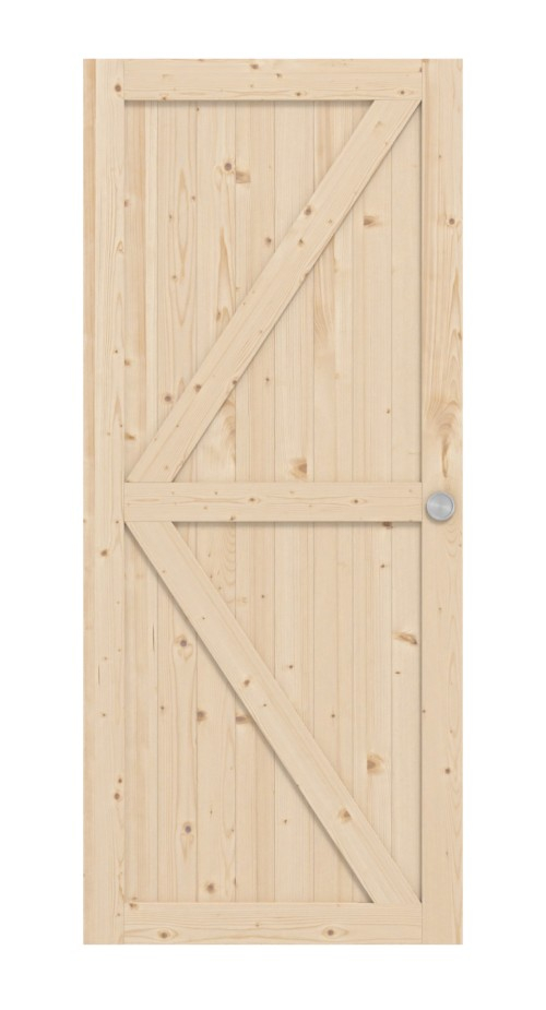 Dzięki wyrazistemu wzorowi strzały drzwi z litego drewna są imponującym elementem wystroju wnętrza. Dwa ukośne belki i jedna zamontowana pomiędzy nimi tworzą interesującą kompozycję w stylu loftowym.