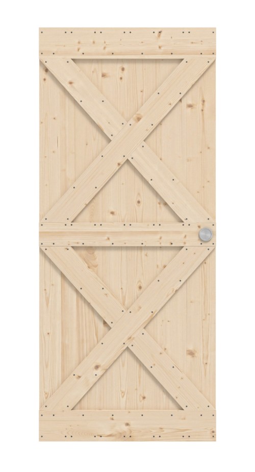 Podwójny kształt litery X stanowi charakterystyczny element przyciągający wzrok na skrzydle drzwiowym. Dwie ukośne listwy krzyżują się i są oddzielone od siebie w środkowej części kolejną listwą. Rustykalny design jest otoczony ramką z listewek na dolnym i górnym końcu. Ciemne śruby stanowią idealne uzupełnienie.