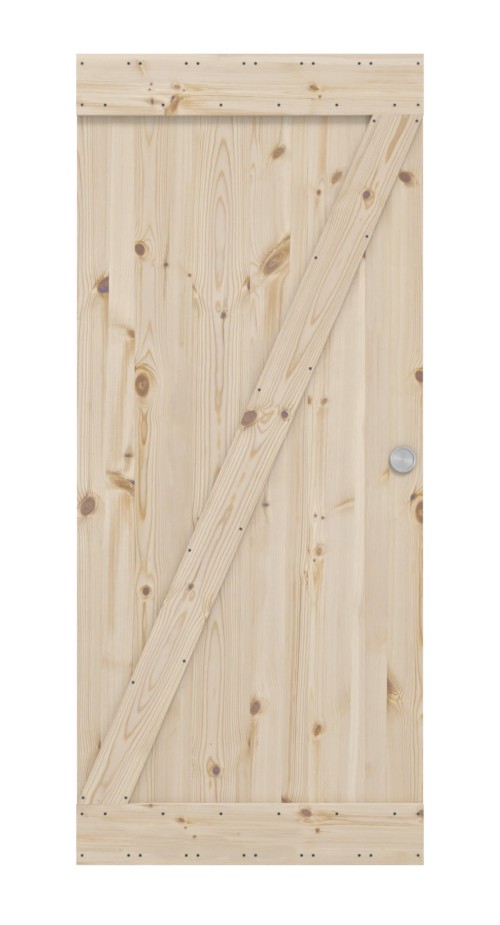 To wyjątkowe skrzydło drzwiowe ma kształt litery Z. Trzy nakładane listwy drewniane tworzą wyjątkowy wygląd. Ciemne śruby zaokrąglone harmonijnie dopełniają oryginalny wygląd drzwi z litego drewna.