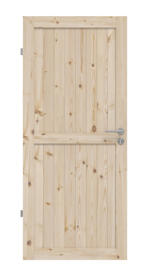 Obramowanie z drewna na całym obwodzie oraz listwa umieszczona pośrodku nadają tym drzwiom z litego drewna nowoczesny design. Minimalistyczny element przyciągający wzrok, o naturalnym wyglądzie.