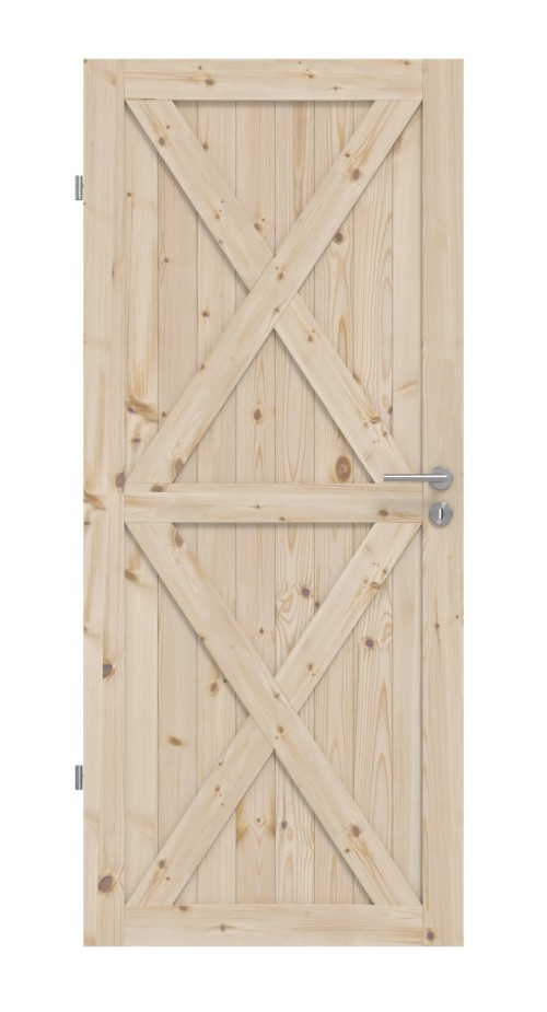 Cztery listwy tworzą dwa charakterystyczne elementy w kształcie litery X, które przyciągają wzrok. Trzy dodatkowe listwy zaokrąglają środkową, górną i dolną część skrzydła drzwiowego i dopełniają nowoczesny design loftowy.