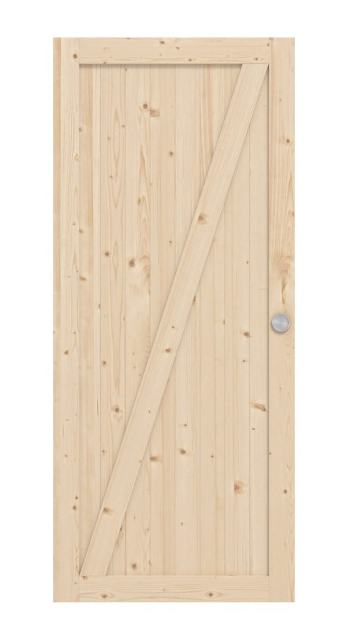Przekątna belka biegnąca przez całe skrzydło drzwi definiuje minimalistyczny styl. Drewniana rama dookoła nadaje ostateczny, rustykalny akcent loftowy.