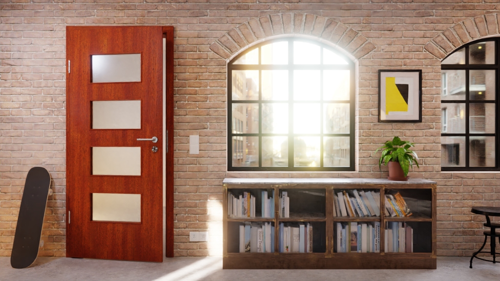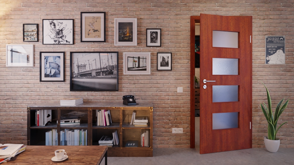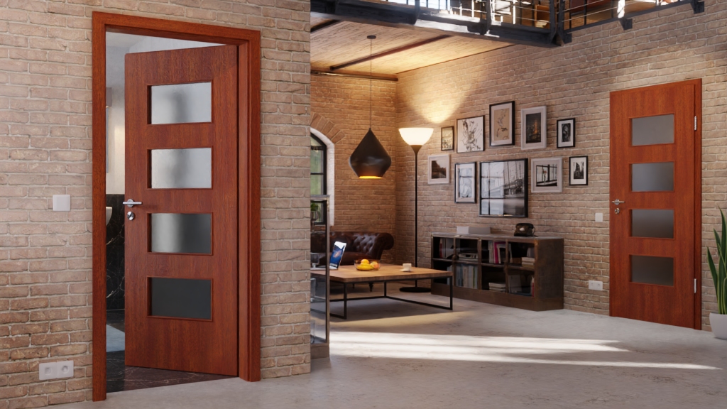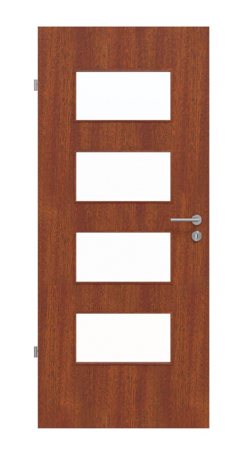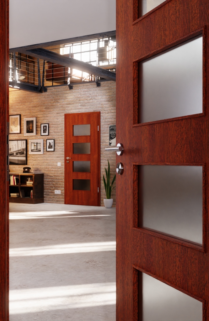 Naturalna harmonia między otworem świetlnym a drzwiami drewnianymi: Gładkie drzwi wewnętrzne z forniru z prawdziwego drewna od Jeld-Wen z serii Optima łączą listwę szklaną z wytrzymałym fornirem z prawdziwego drewna w kolorze mahoniowym.
