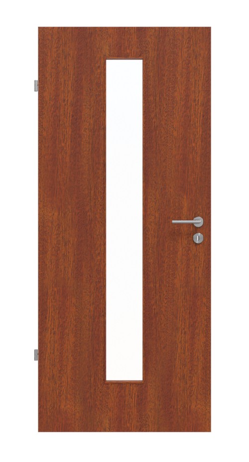 Dopasowane drzwi drewniane z otworem na światło: Gładkie drzwi Jeld-Wen z serii Optima są okleinowane prawdziwym drewnem mahoniowym i łączą szklany wstaw z odporną strukturą.