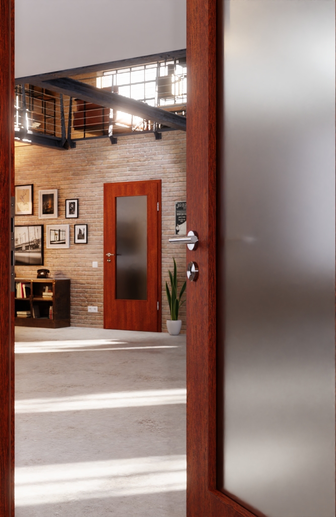Dzięki przeszklonemu otworowi w tych drzwiach uzyskuje się otwarte poczucie przestrzeni. Opcjonalnie z klasycznym przezroczystym szkłem lub modną wariacją szkła. Stabilność zapewnia rama z twardego drewna wewnątrz drzwi.