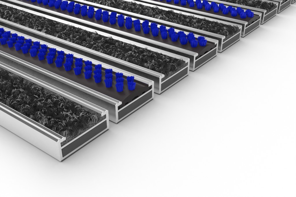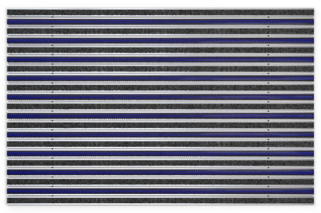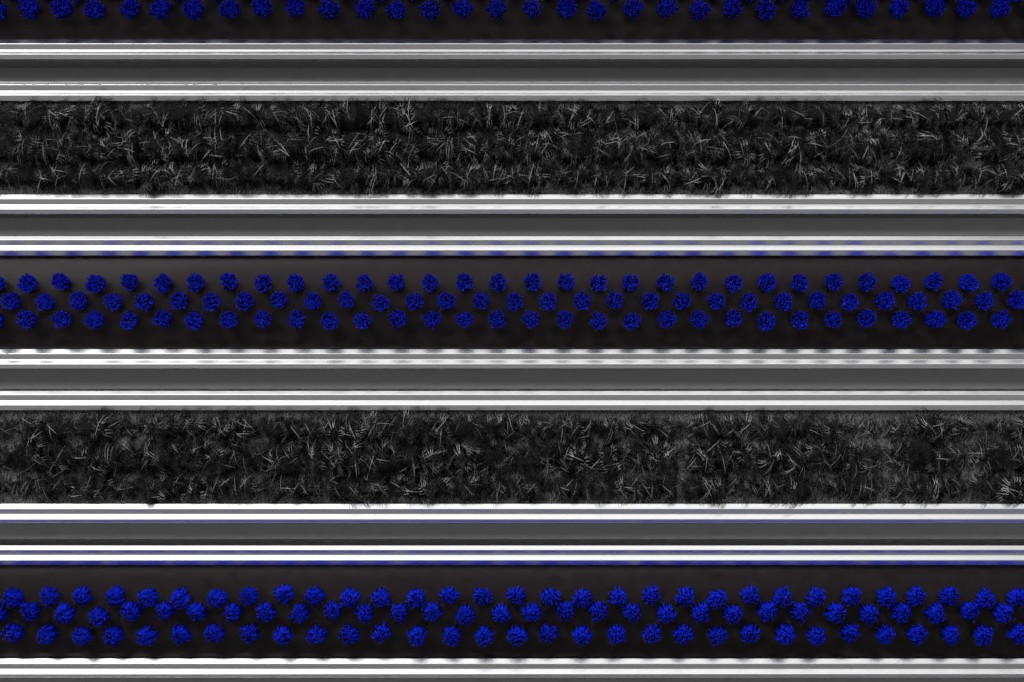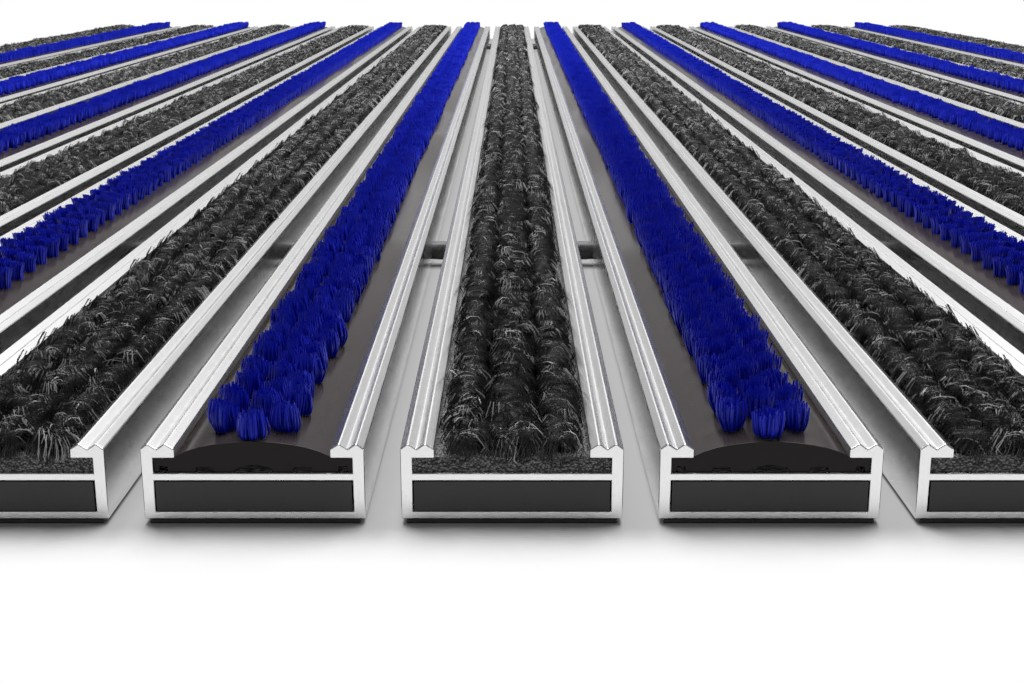 Pasujące paski z polipropylenu w kolorze czarnym i szczotki kasetowe w kolorze niebieskim są ze sobą połączone w tych matach. Otoczone są solidnymi profilami aluminiowymi. Razem materiały doskonale usuwają grube i drobne zanieczyszczenia oraz wchłaniają wystarczającą ilość wilgoci. Maty z profilami aluminiowymi są dzięki swoim właściwościom idealne do wnętrz oraz na zewnątrz z odpowiednim zadaszeniem.