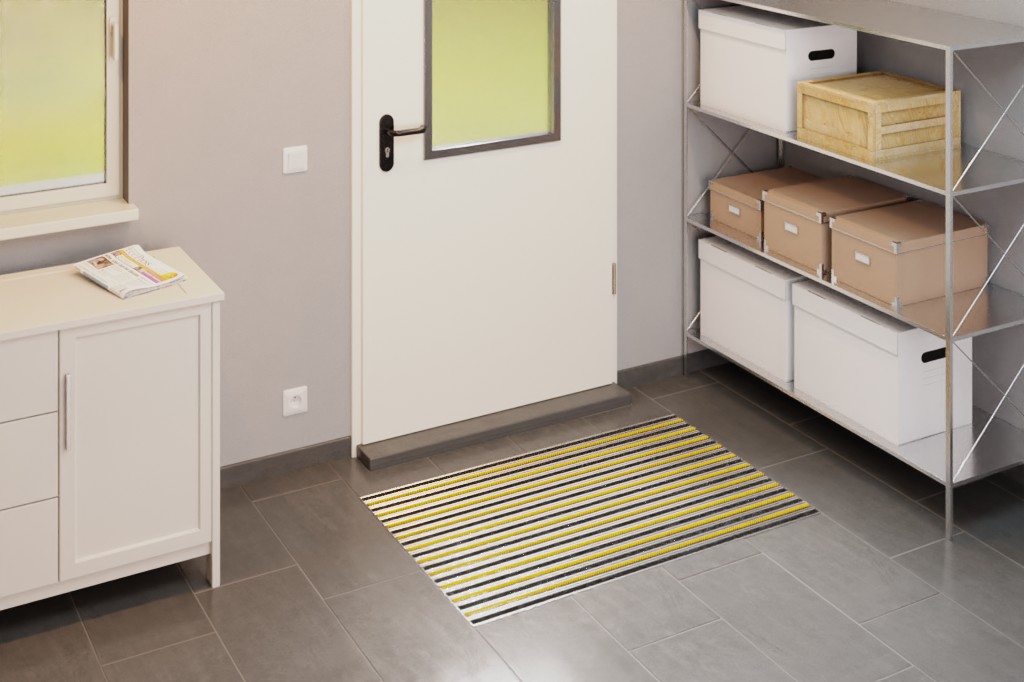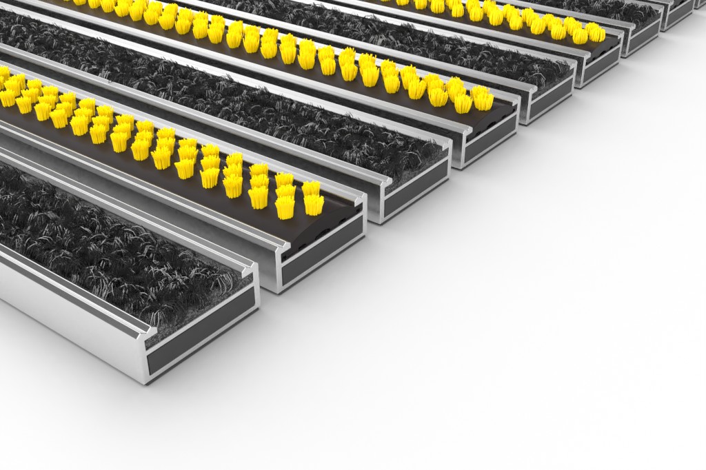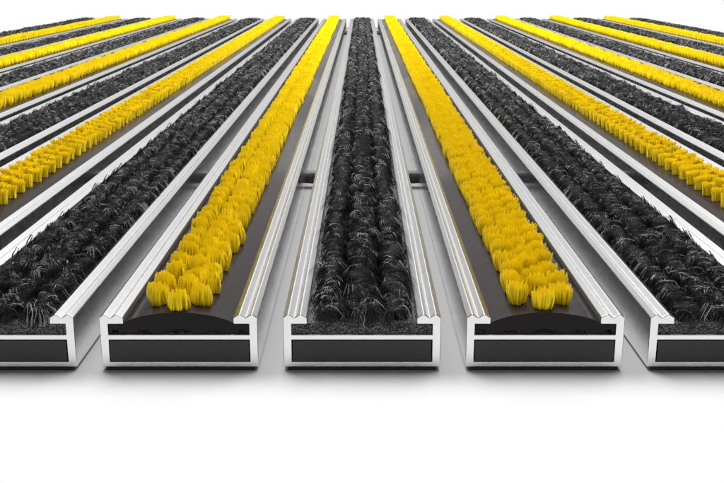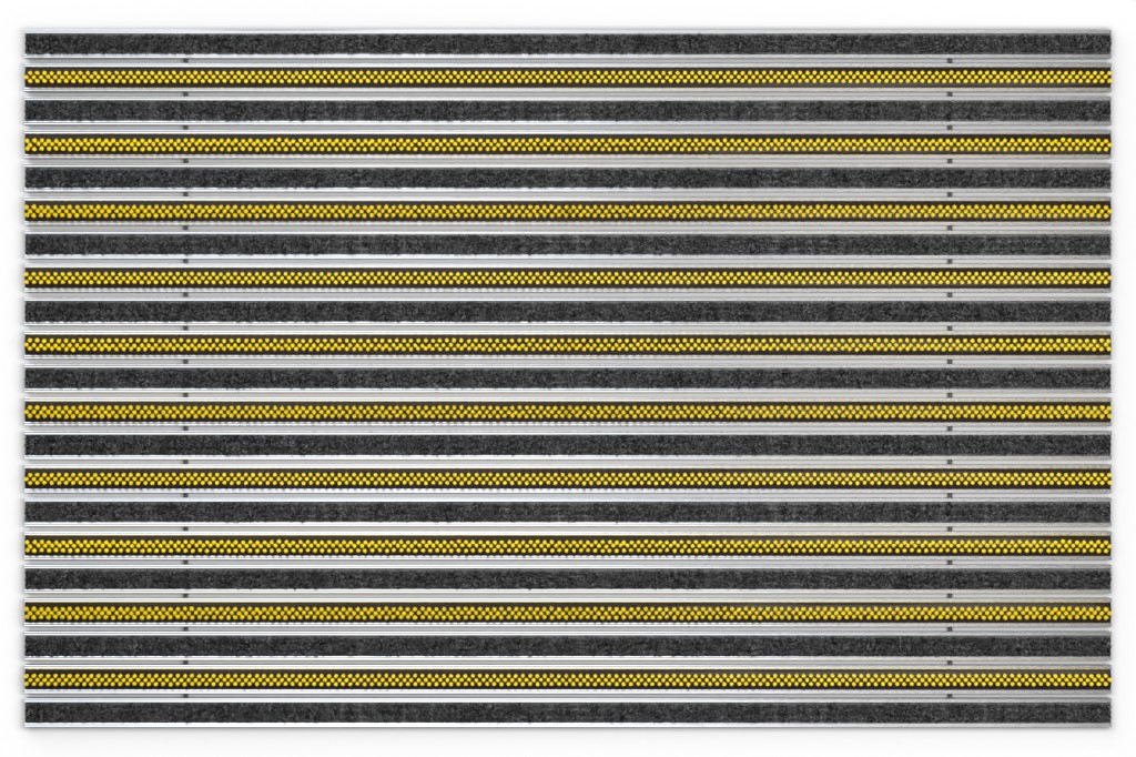 Twoje wejście zyskuje indywidualny wygląd dzięki czarnym paskom i żółtym szczotkom kasetowym. Różne materiały są obramowane profilami aluminiowymi, co sprawia, że są sztywne na skręcanie. Razem materiały doskonale usuwają gruby i drobny brud oraz wchłaniają wystarczającą ilość wilgoci. Maty aluminiowe dzięki swoim właściwościom są idealne do wnętrz i na zewnątrz z odpowiednim zadaszeniem.