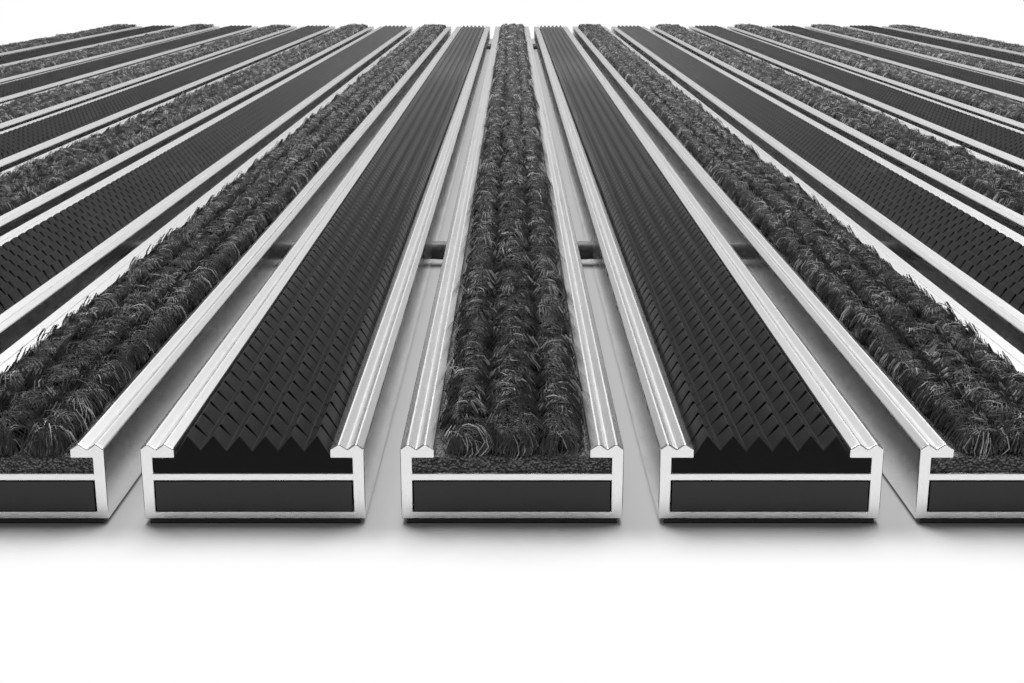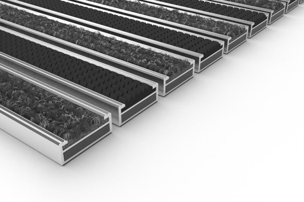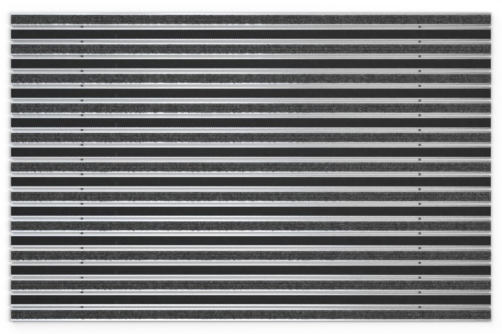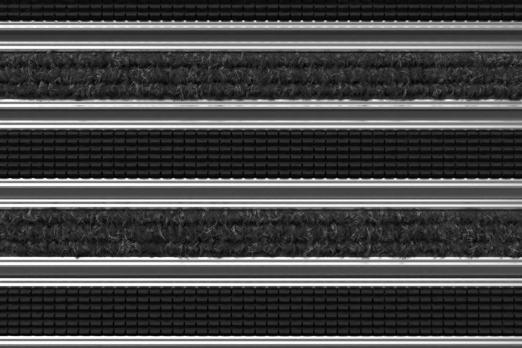 Czarne paski gumowe i antracytowe paski ripsowe przeplatają się w rzędach. Mieszanka materiałów zapewnia wysoką funkcjonalność. Paski gumowe zapobiegają dalszemu transportowi wilgoci. Paski ripsowe usuwają drobne i grube zanieczyszczenia oraz pozostałą wilgoć z Twoich podeszw.
