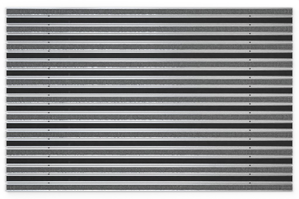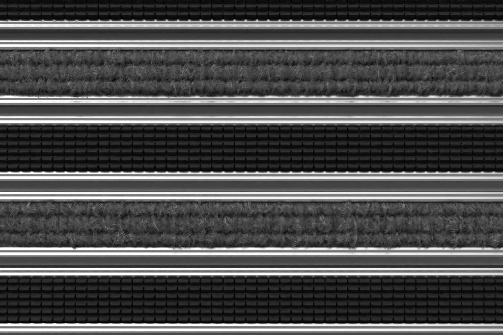 Czarne paski gumowe i szare paski ripsowe przeplatają się w rzędach. Mieszanka materiałów zapewnia wysoką funkcjonalność. Paski gumowe zapobiegają dalszemu transportowi wilgoci. Paski ripsowe usuwają drobne zanieczyszczenia, grube zanieczyszczenia i pozostałą wilgoć z Twoich podeszw.