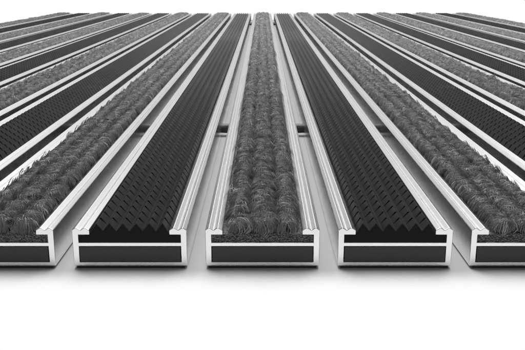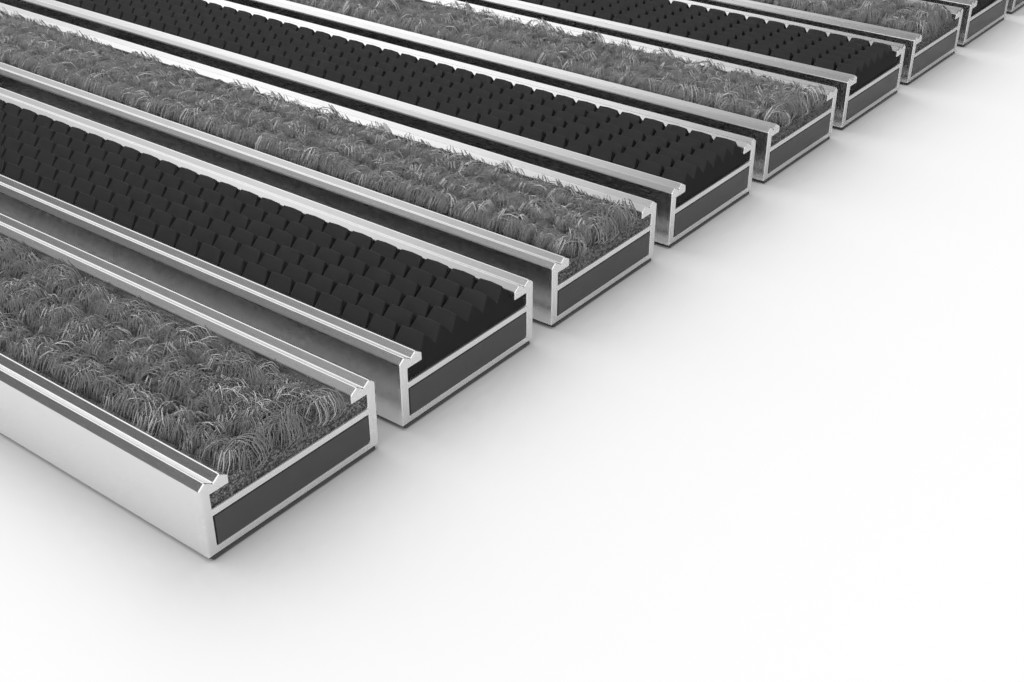 Materiał wierzchni otoczony jest profilami aluminiowymi. Dzięki ramie mata pozostaje sztywna, nie przesuwa się i może być używana z wózkiem inwalidzkim.