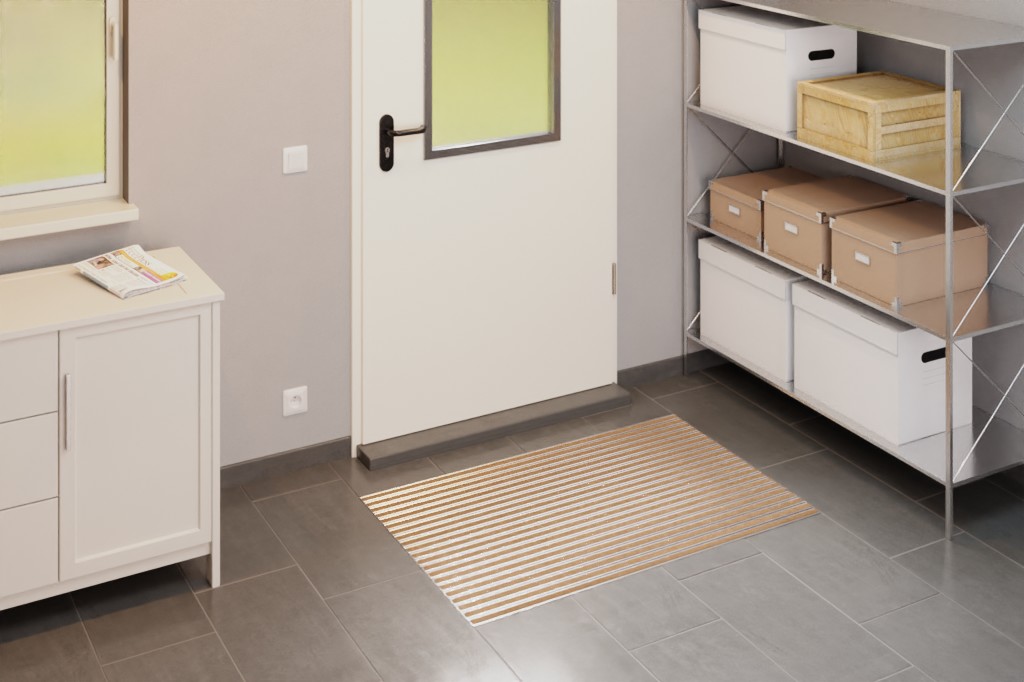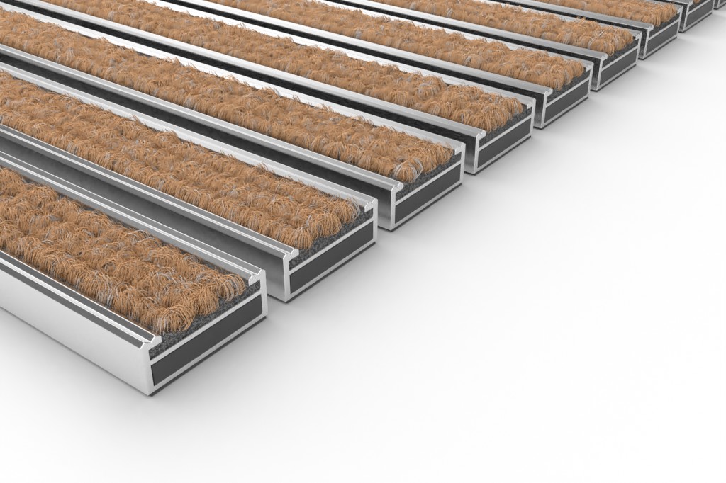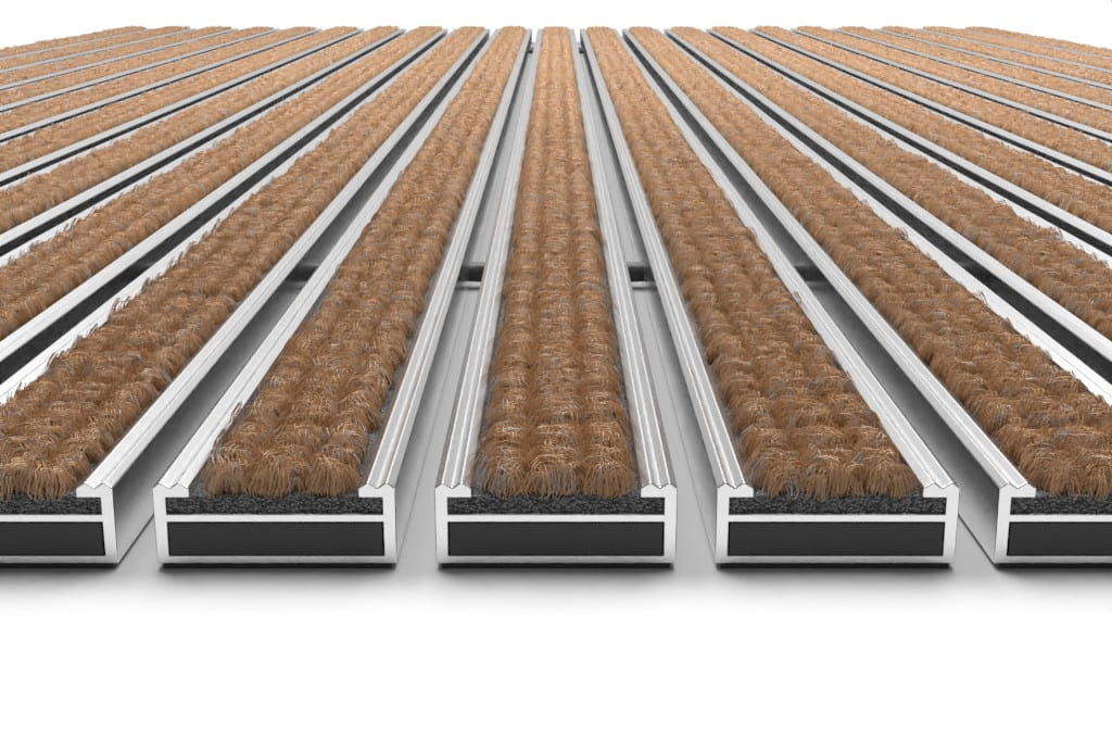 Czyszczenie podeszw butów odbywa się dzięki 30 mm szerokim paskom Rips z polipropylenu w kokosie. Drobne zanieczyszczenia oraz wilgoć są usuwane z podeszw, co utrzymuje Twoje wejście w czystości. Dzięki profilom aluminiowym paski są odporne na skręcanie. Optymalne maty wejściowe dopełniają profile tłumiące dźwięk przy chodzeniu.