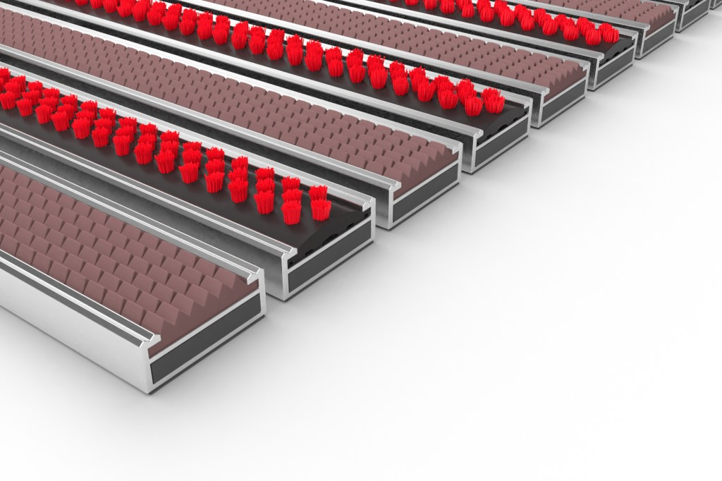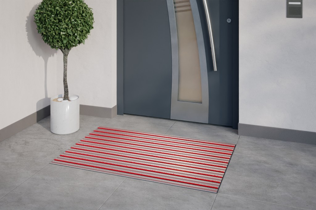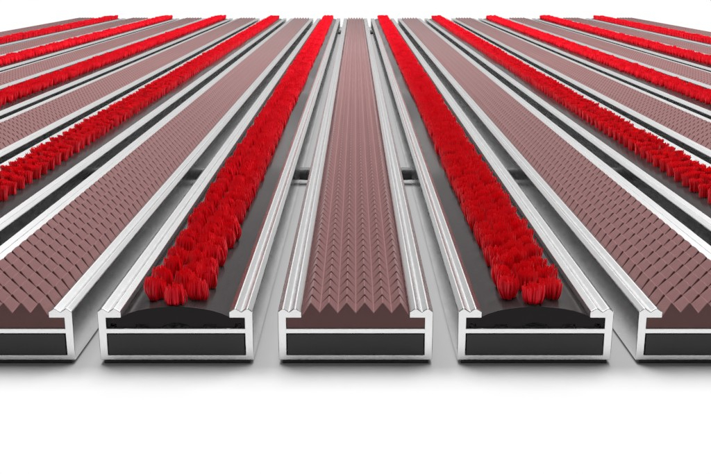 Wycieraczka wejściowa z brązową gumą i wycieraczką z wkładem szczotkowym w kolorze czerwonym.