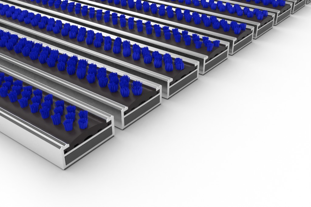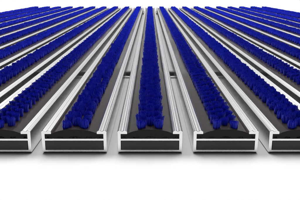 Mata z profilu aluminiowego ze szczotkami w kolorze niebieskim do niezadaszonych obszarów na zewnątrz.
