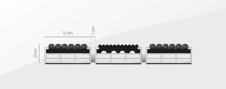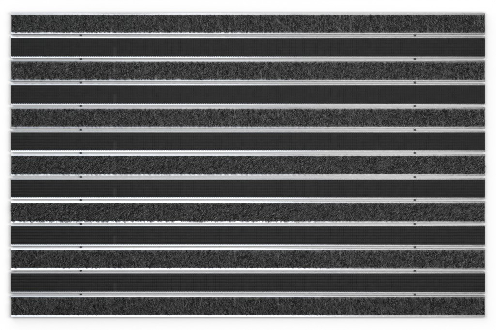 Kombinacja czarnych pasków ripsowych i czarnych szczotek kasetowych zdobi powierzchnię maty wejściowej. Czy umieszczasz matę w zadaszonej przestrzeni zewnętrznej lub wewnętrznej? To idealne rozwiązanie, ponieważ elementy ripsowe i gumowe skutecznie usuwają drobny brud i niepożądaną wilgoć. Niezwykle szeroka i bezpieczna: 55 mm to szerokość profili. Dzięki temu jeszcze więcej brudu i wody jest wchłanianych. Dodatkowa izolacja akustyczna sprawia, że Twoje kroki są cichsze.