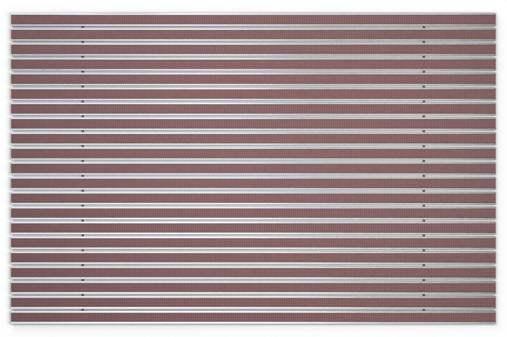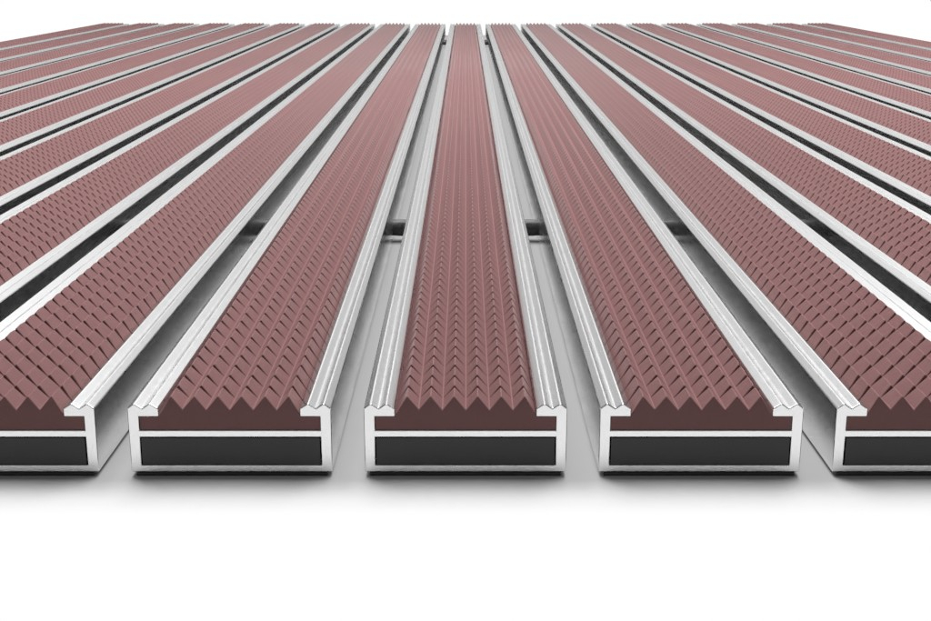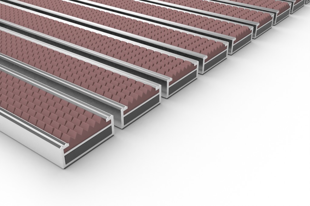 Ok. 31 mm szerokie brązowe paski gumowe są ułożone w odstępach 5 mm i oferują przyczepność dzięki żłobionemu profilowi antypoślizgowemu, nawet przy wilgotnych podeszwach. Paski są wspierane przez profile aluminiowe, które sprawiają, że są sztywne i odporne na duże obciążenia. Wytrzymałość materiału umożliwia również poruszanie się na wózku inwalidzkim.