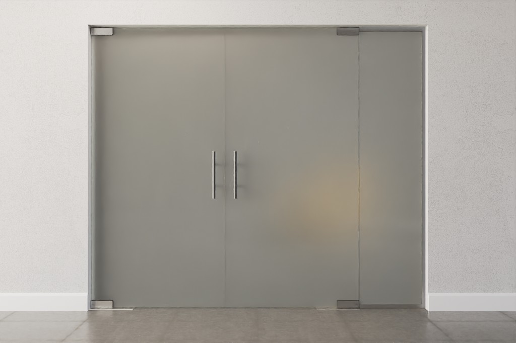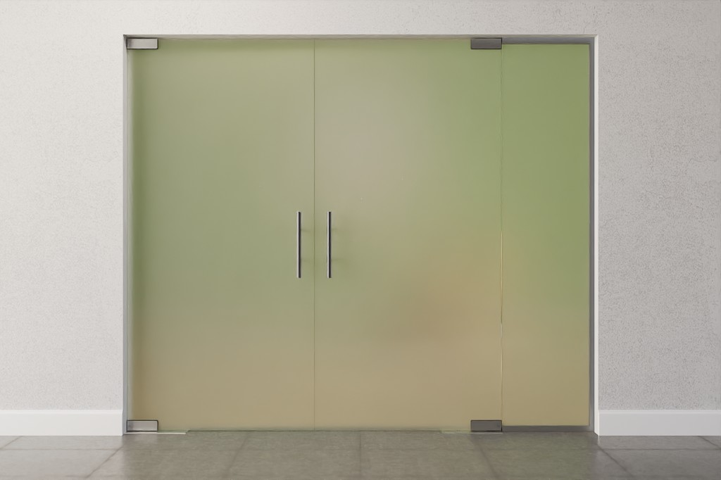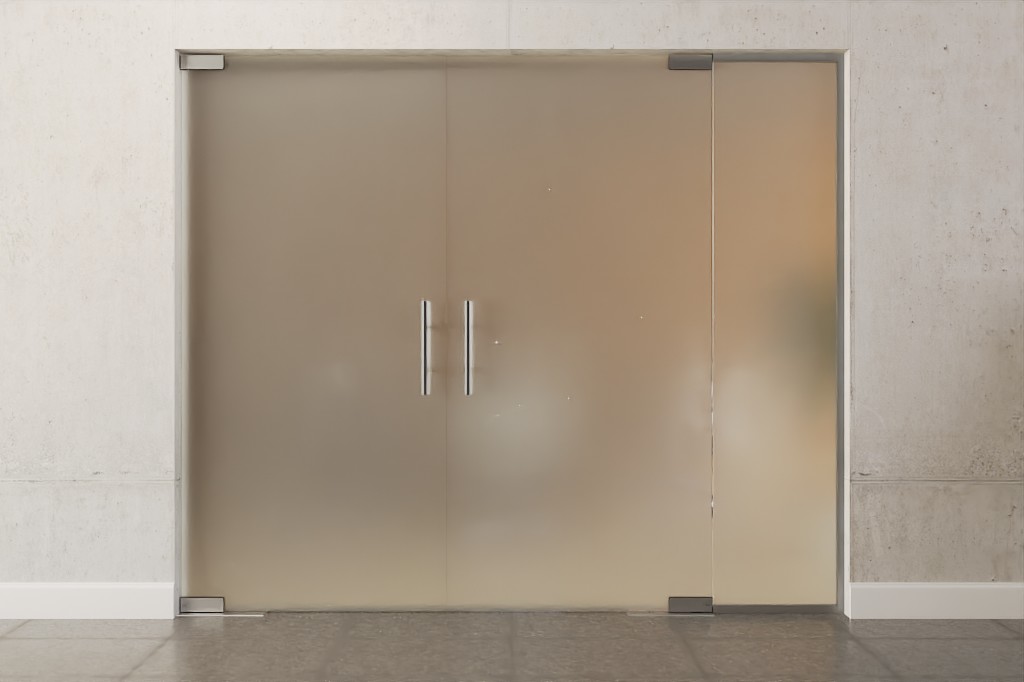 Dekoracyjna szklana konstrukcja z drzwiami wahadłowymi z podwójnymi skrzydłami i boczną częścią z wytrzymałego i specjalnie pokrytego szkła bezpieczeństwa: