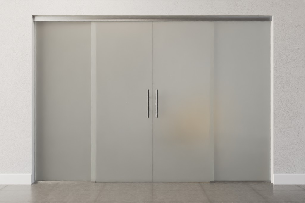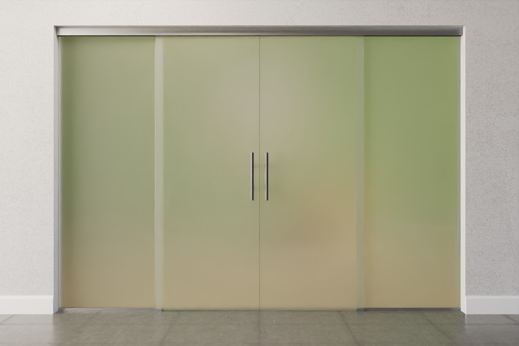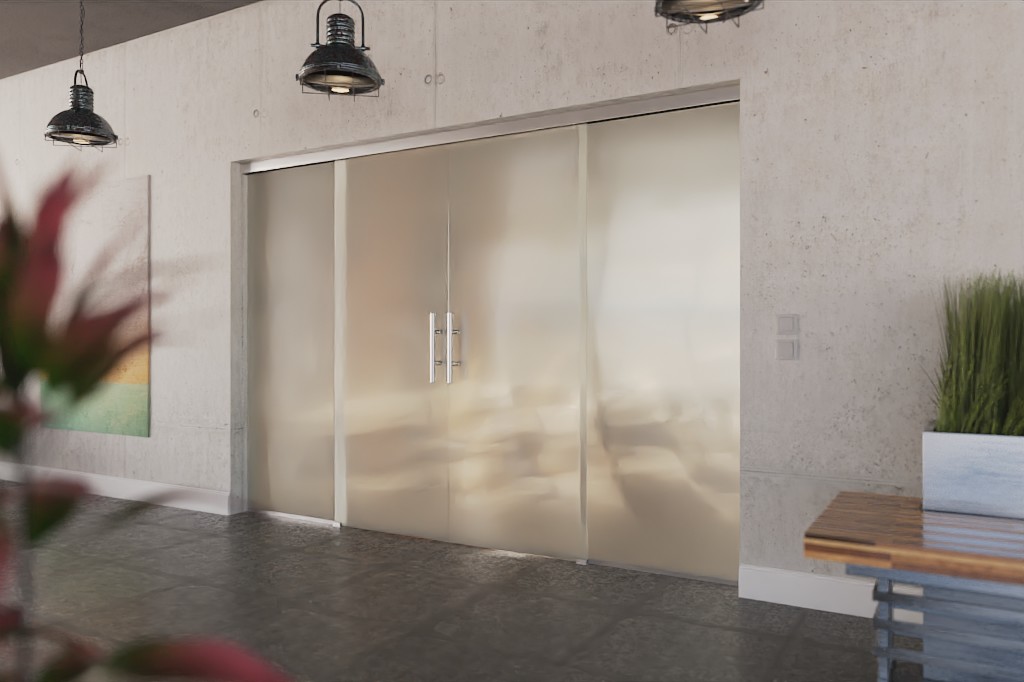 Całkowita szerokość systemu szklonego rozkłada się równomiernie na skrzydła drzwiowe i elementy boczne, co tworzy symetryczny wygląd.